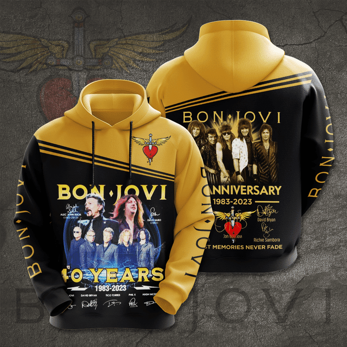 Bon Jovi Rock Band Signatures 40 Years Anniversary 3D Unisex Pullover Hoodie – Black Yellow IHT1869