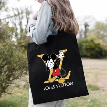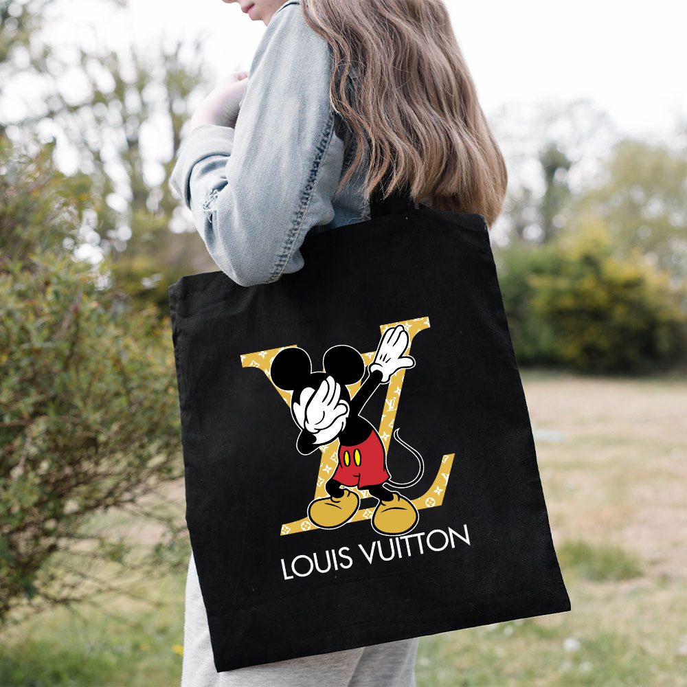 Louis Vuitton Luxury Logo Yellow And White Monogram Canvas Pattern Mickey Mouse Dabbing Cotton Canvas Tote Bag TTB1686