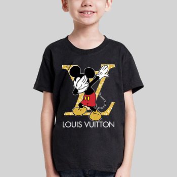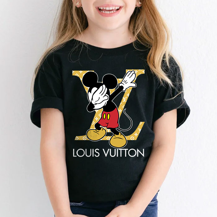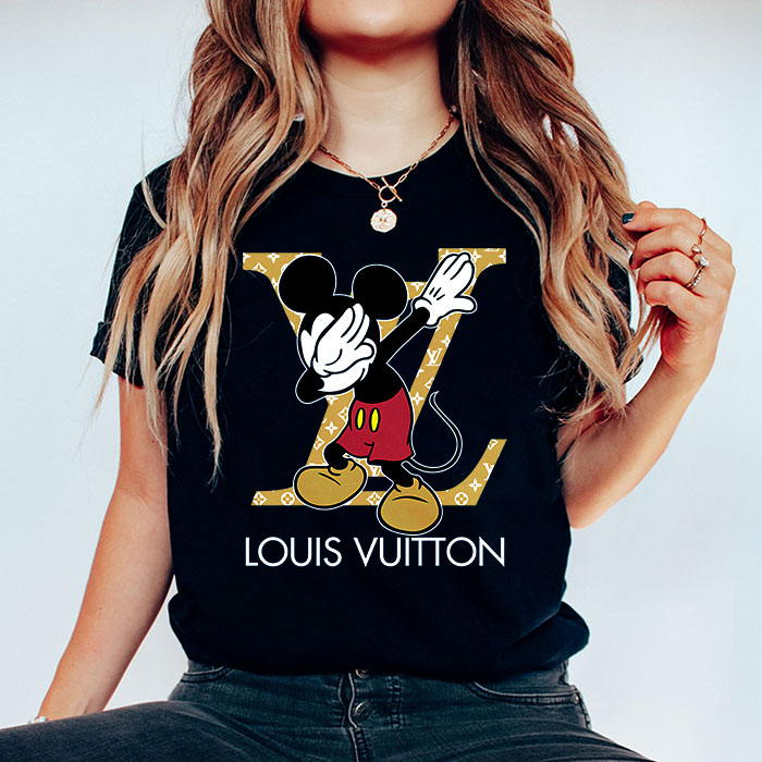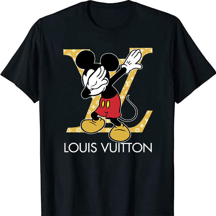 Louis Vuitton Luxury Logo Yellow And White Monogram Canvas Pattern  Mickey Mouse Dabbing Lady T-Shirt Luxury Tee For Women LDS1688