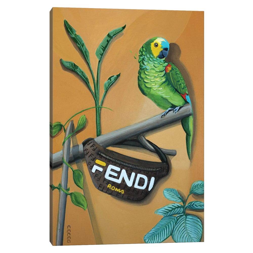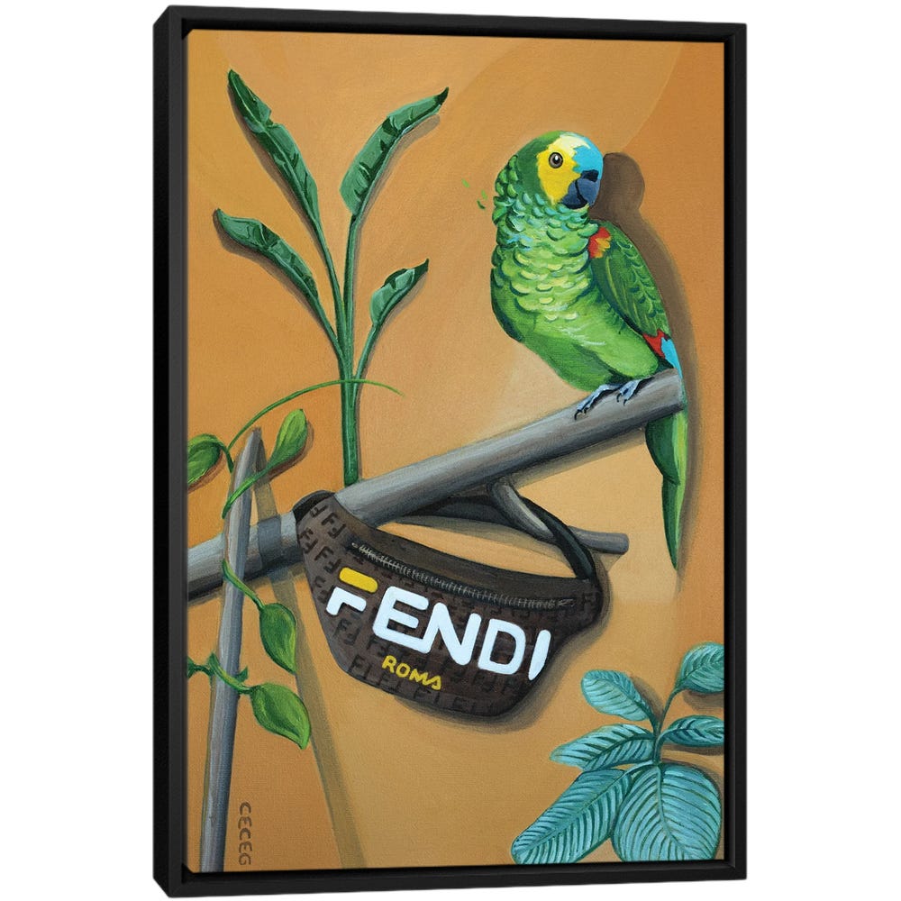Parrot With Fendi Bag – Black Framed Canvas, Stretched Wrapped Canvas Print, Wall Art Decor